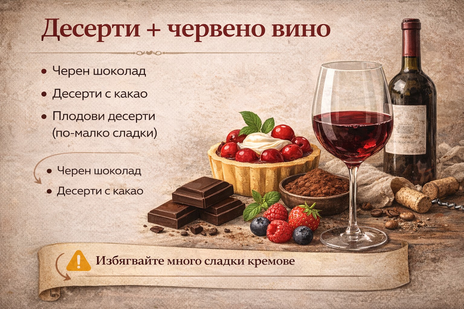 При десерти с по-малко захар и повече какао могат да работят по-плътни, по-плодови червени вина.