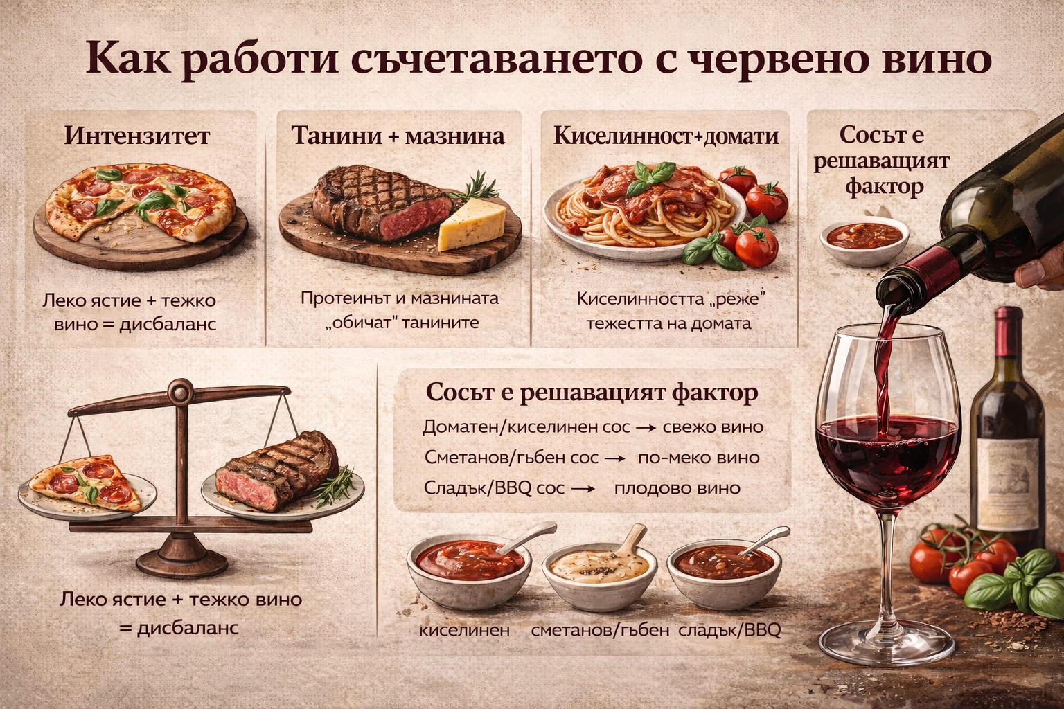 - доматен/киселинен сос → вино с по-висока киселинност